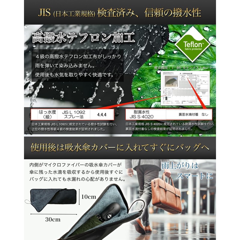 - JIS tested by a Japanese specialist institute: GDEEL's latest folding umbrella has been tested for water repellency and strength at the Kaken Test Center, and is a durable, one-touch automatic opening and closing umbrella that has passed the test of high water repellency grade 4 class water repellency and tensile strength test