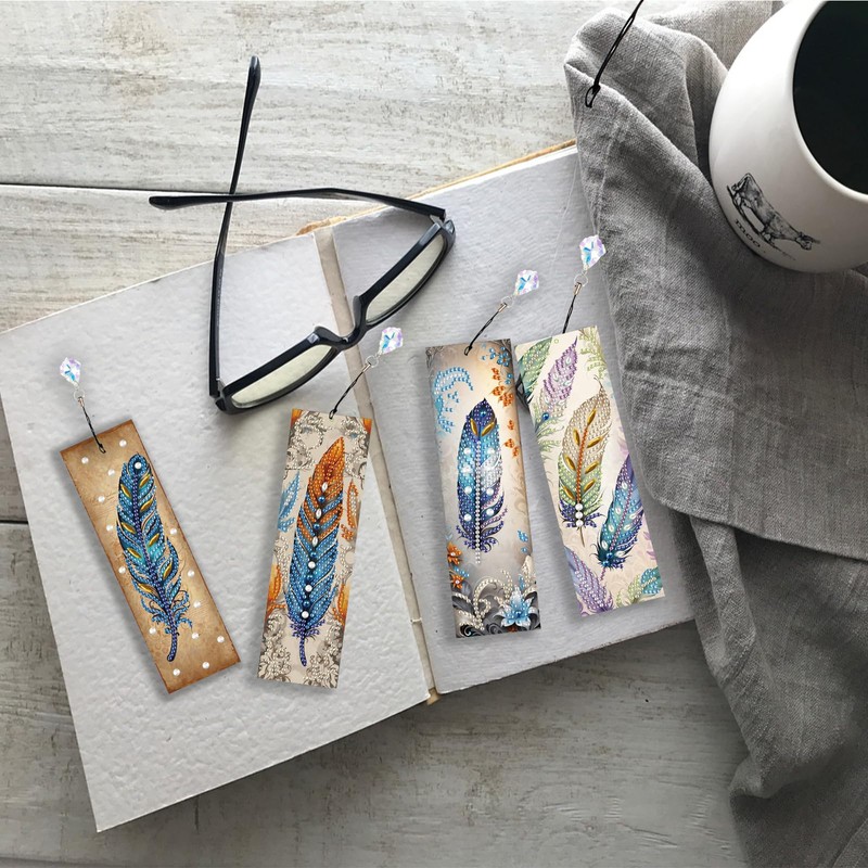 JISHSHAY 4 PCS Diamond Art Bookmarks Diamond Painting Book Marks Gem Art Bookmarkers Gem Painting Book Markers Mosaic Kits for Adults Special Shaped Drills with Crystal Pendants Feather