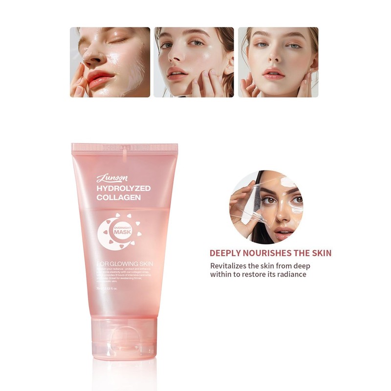 Collagen night wrapping mask, soothes and deeply nourishes skin throughout the night, boosts skin's nocturnal renewal cycle, rouse radiant and glowing skin. Hydrolyzed collagen facial mask richs in collagen, deep into the skin's underlying layers, maintains skin moisture balance and enhances barrier function. Reduce sagging and Dullness, reduces enlarged pores, improve skin elasticity, and reduce wrinkles. Formulated with natural, gentle ingredients for all skin types, offering versatility and comfort. After cleansing, apply the mask using the included silicone jelly brush for an even layer. the next morning, gently peel off the mask or rinse with lukewarm water.