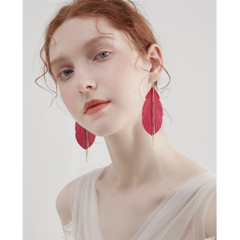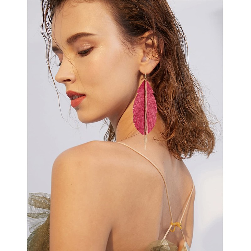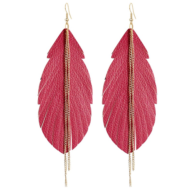 JIUIQL Unique Handmade Fashion Large Leopard Soft Leather Fringe Feather Dangle Drop Color Earrings Lightweight Faux Leather Sparkly Shine Glitter Leaf Earring for Women Statement Jewelry Gifts (Rose Red)