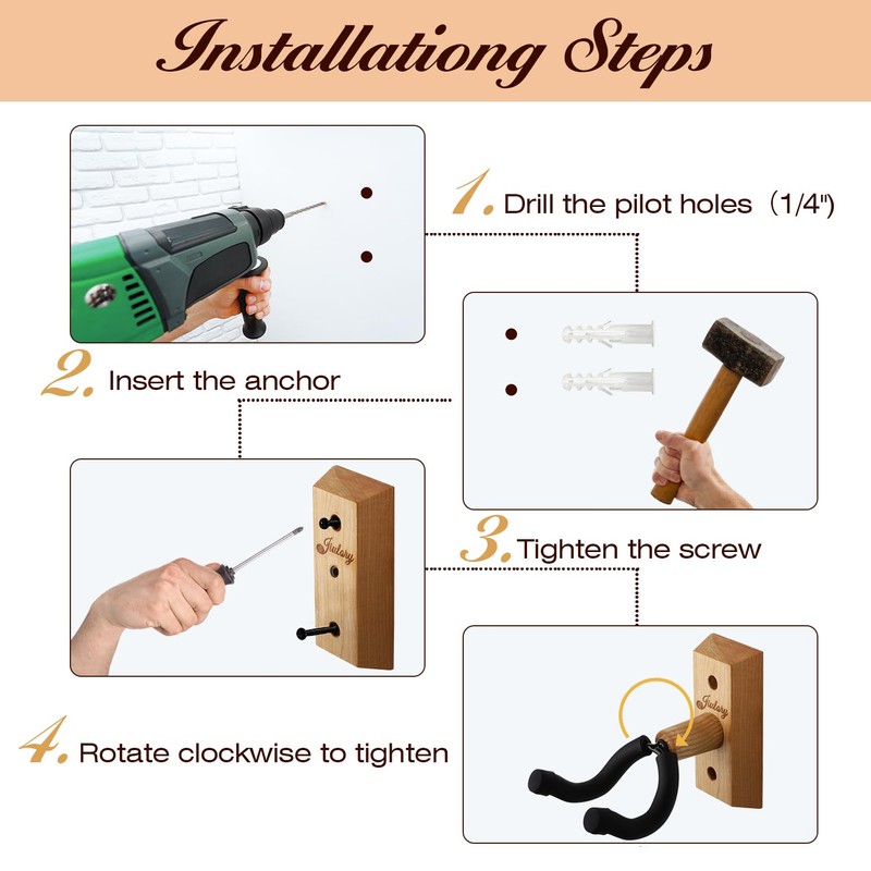 - 【Easy to Install】Our electric guitar holder wall mount is designed for effortless installation. The package includes two long screws and sturdy drywall anchors, ensuring a secure mount on various wall types. With all the necessary accessories and clear instructions provided, you can easily hang your electric guitar in no time. Enjoy the convenience and security of our electric guitar holder wall mount.