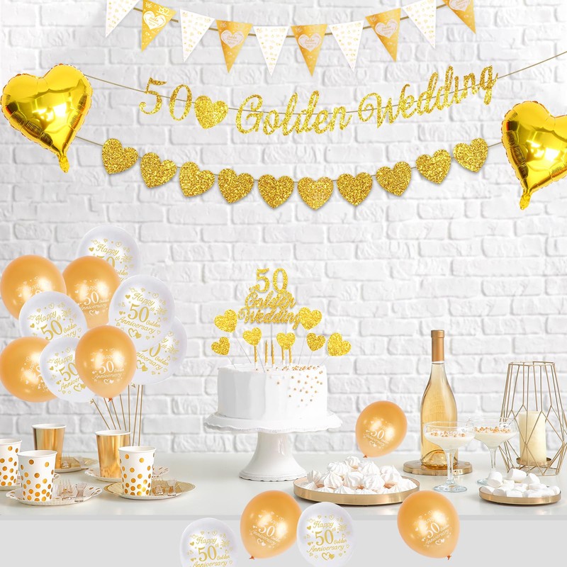 - 50th Anniversary Decorations Includes: Golden 50th Anniversary Pull Flag x 1, Triangle flag x 1, Golden Heart Flag x 1, 50th Anniversary Balloon ( Golden x 10, White x 10 ), Golden heart balloons x 2, Gold cake plaque x 1, White ribbon x 1