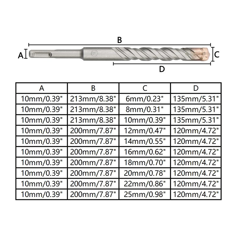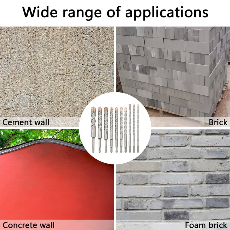 • With their carbide composition and ultra-tough tips, these drill bits are able to chip away in masonry applications; brick, stone, concrete, block, stucco, etc. Concrete drill bits set is fully compatible with All SDS-Plus Rotary Hammer Drill.