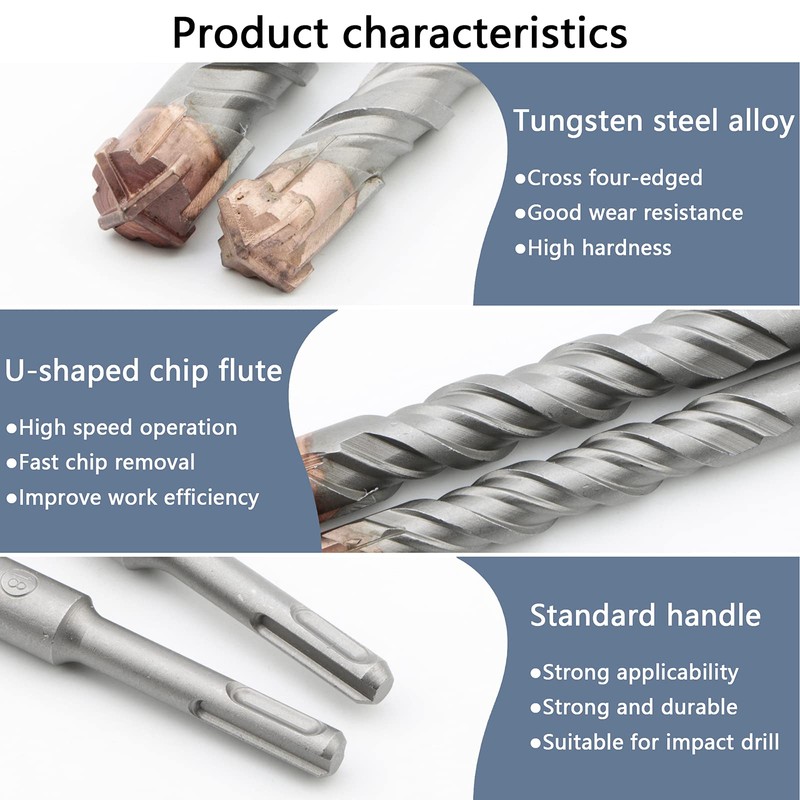 • SDS hammer drill bit features a double u-fluted design can high-speed drilling, cleans debris out fast for easier, low resistance and low drilling wear, work time longer.