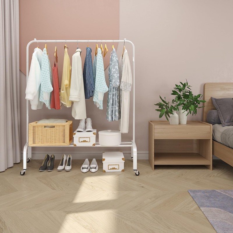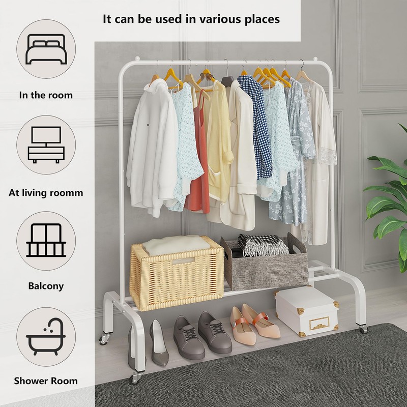 - 【Practical Product Design】-- The bottom of the garment rack is a small shoe rack, you can use it to place shoes or shoe boxes, it not only gives you more storage space, it also makes the garment rack more stable.There are two non-slip beads on the top of the garment rack, which not only prevents the clothes from falling off, but also makes the garment rack look more beautiful. The bottom has been changed to a 360 ° universal wheel, making it easier for the hanger to move. Two of the wheels are equipped with brakes, which can keep the garment rack stable and standing without shifting.