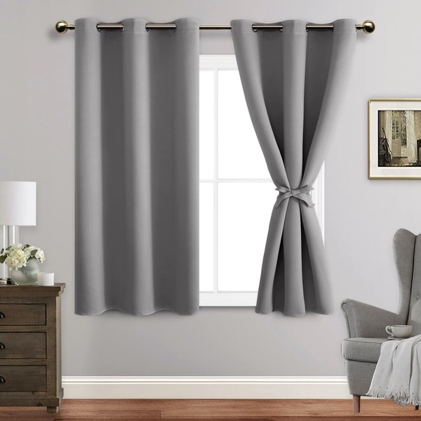 JIUZHEN Short Blackout Curtains with Tiebacks for Small Window, Bedroom Darkening Drapes Light Blocking Noise Reducing Grommet Window Curtains for Living Room, Set of 2 Panels, 42W x 45L,Light Grey