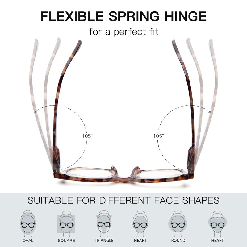• 👓【Flexible Spring Hinge】Our glasses feature a flexible spring hinge adjustable design,This design helps reduce uncomfortable pinching and stress, making them suitable for different face shapes