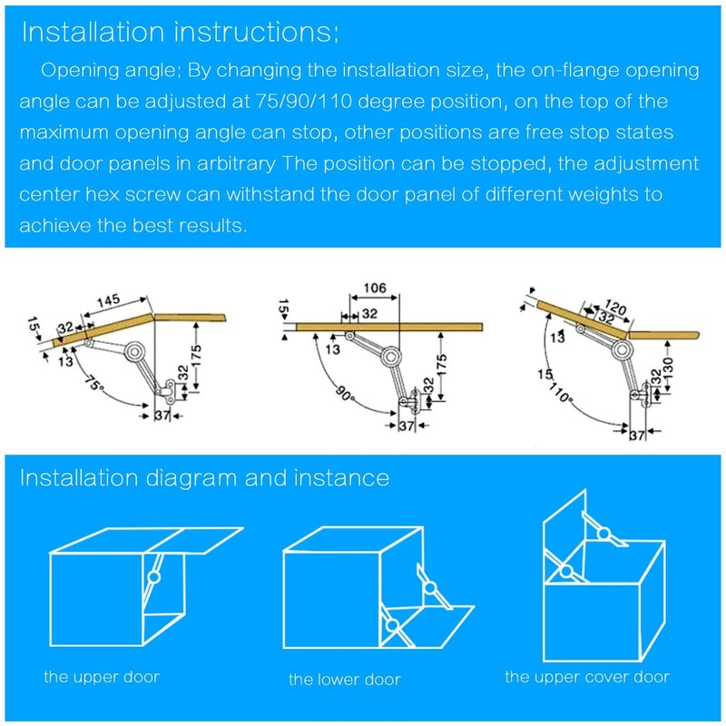 - 【Easy to install】 Our package contains screws for installation, so there is no need to buy screws in other ways. By changing the installation position, the opening angle of the door can be adjusted at the maximum positions of 75 °, 90 °and 100 °(or 105 °).