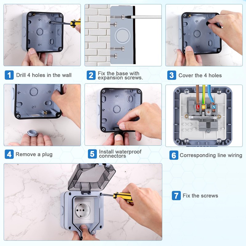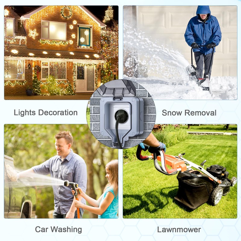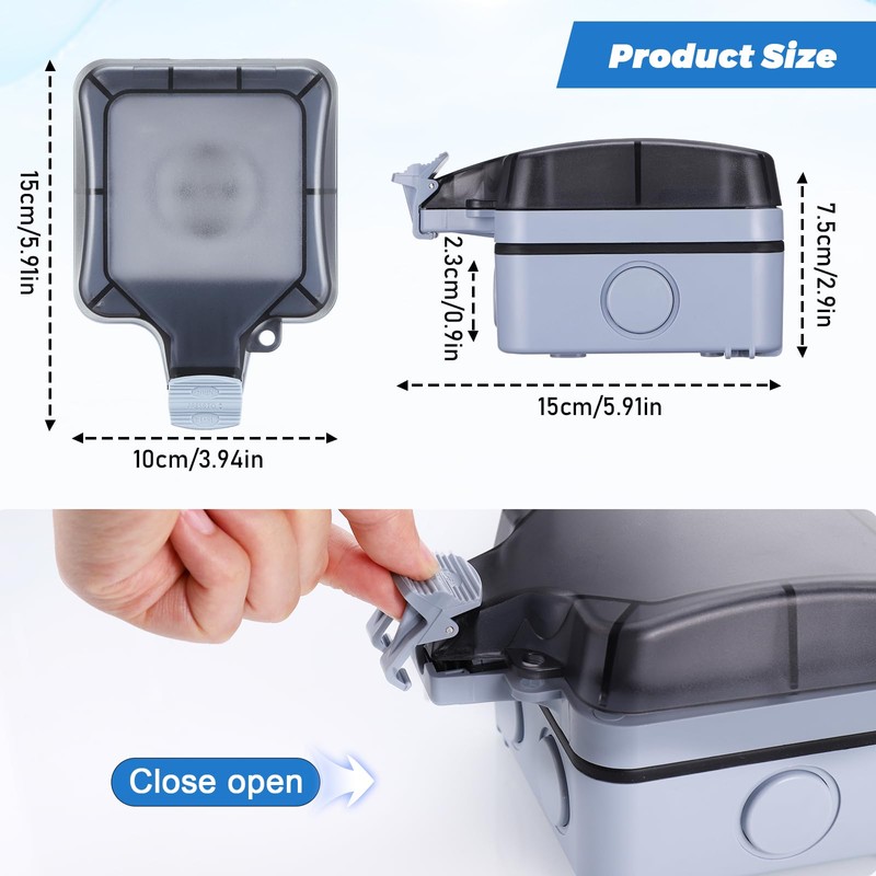 • Durable material: outdoor socket waterproof made of high-quality PC material is durable and offers high protection against water and dust. Sturdy and impact resistant body, will not break or fade. Sealing ring is made of rubber. Can effectively prevent water mist and dust from entering