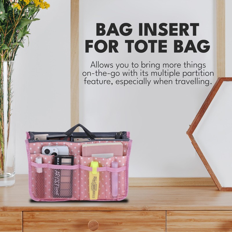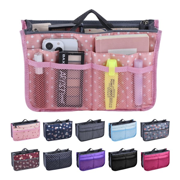 JJ PRIME - Multi Compartment Bag Handbag Insert | Expandable Handbag Organiser Insert | Pink Tote Bag Organiser Insert | Tote Bag Divider Organiser with 13 Pockets (Polka Dots, Pink)