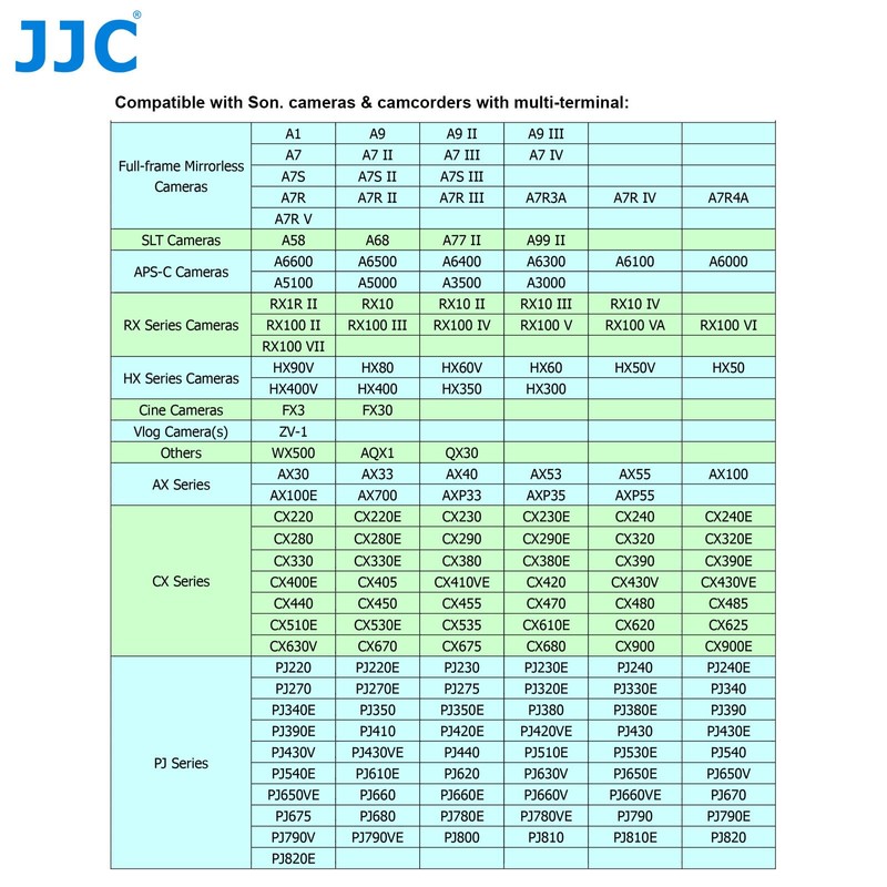 - Compatible with Sony Alpha / Cyber-shot cameras and camcorders with multi-terminal, e.g. Sony ZV-1, A99 II, A77 II, A68, A58, A9, A9II, Sony A7, A7II, A7III, A7IV, A7R, A7RII/ A7RIII, A7RIV, A7S, A7SII, A7SIII, A6600, A6500, A6400, A6300. 00, A60000, RX1RII, RX10, RX10II, RX10III, RX10 IV, RX100M2, RX100M3, RX100M4, RX100M5, RX100VA, RX100M6, RX100M7, HX50, HX60, HX80, HX90V, HX300. HX350 HX400, QX30, WX500, AX30, AX33, AX40, AX53, AX55, CX220, CX230, PJ270, PJ220, PJ230, PJ240, CX900 etc.