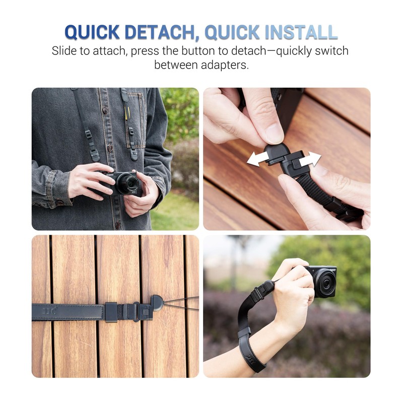 The quick release adapter lets you quickly and securely attach and detach the JJC QRS-M1 & JJC QRS-D1 series quick release sling strap or JJC WS-1 wrist strap with our patented quick release buckle from your camera.