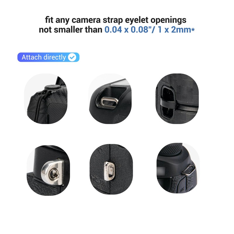 *NOTE: This adapter is compatible with the camera strap eyelet openings not smaller than 0.08 x 0.16"/ 2 x 4mm*. If the camera eyelet opening is smaller than 0.08 x 0.16"/ 2 x 4mm*, please use the adapter with a triangle or round ring.