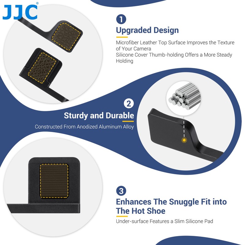 - The handle for the thumb rest is made of anodised aluminium alloy for durability. The microfiber leather on the top of the handle enhances the texture of your camera. On the bottom of the hot shoe there is a thin silicone pad that improves the firm fit in the hot shoe.