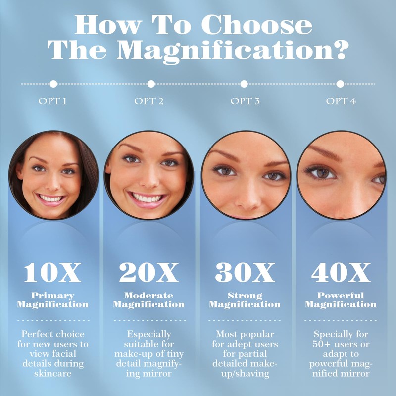 1)The magnification mirror is very powerful, the pores of the face are clearly visible, which is good for detailed makeup needs, shaving, or deep cleaning. It helps make sure everything on your face looks exactly good. And there are 10times, 20times, 30times for option to meet your needs.