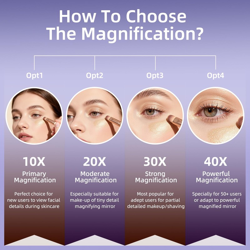 1)The magnification mirror is very powerful, the pores of the face are clearly visible, which is good for detailed makeup needs, shaving, or deep cleaning. It helps make sure everything on your face looks exactly good. And there are 20times, 30times, 40times for option to meet your needs.