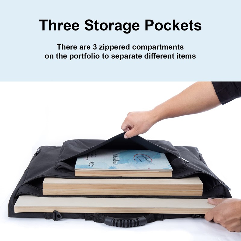 - Three Storage Pockets: There are 3 zippered compartments on the portfolio to separate different items: 2 large pockets are to store posters, canvases, or drawing boards, and a small one below can be used to hold pigments, paintbrushes, and other tiny art supplies