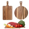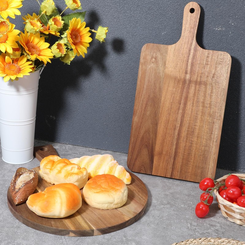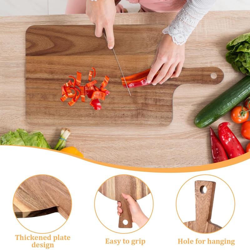 - Convenient Handle with Hook: Each cutting board with handle features a 4-inch ergonomic grip and hanging hole for space-saving storage. The round and rectangular wood cutting boards can be easily displayed on walls or counters when not in use. This practical design enhances kitchen organization while showcasing the boards' natural beauty as decorative pieces