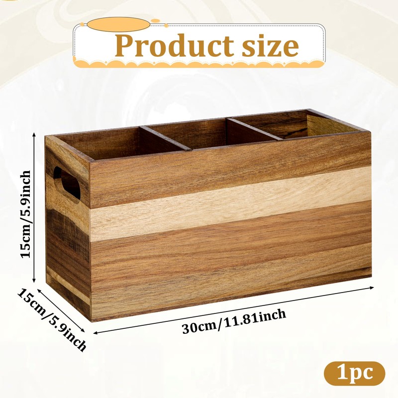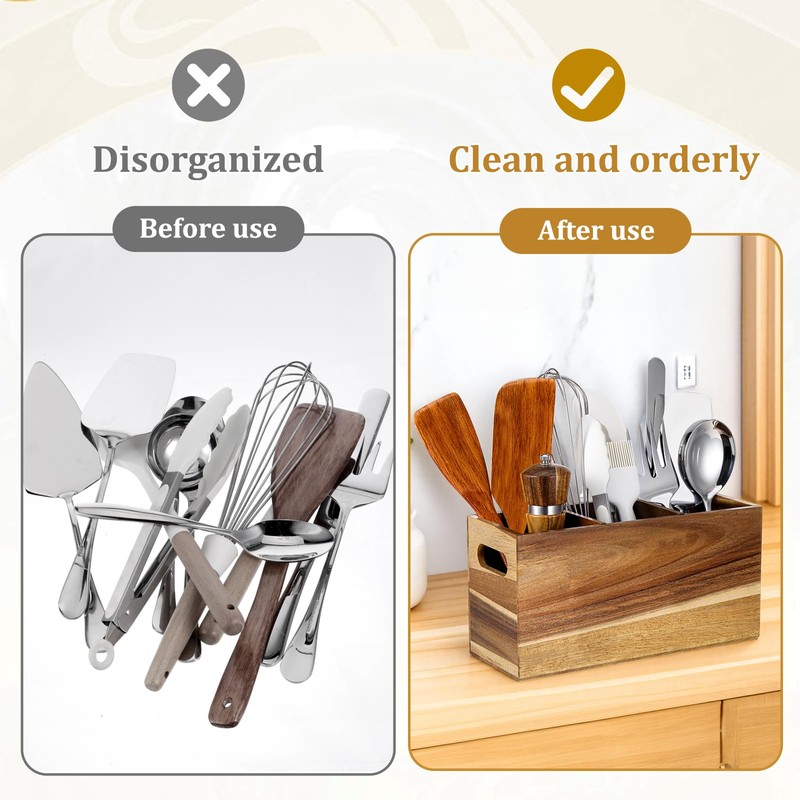Crafted from durable acacia wood, this wood utensil organizer combines natural beauty with practical functionality. The high-quality construction ensures long-lasting use, while the waterproof finish protects against daily kitchen moisture. The 3-compartment wooden utensil holder features removable dividers for flexible storage options and easy cleaning
