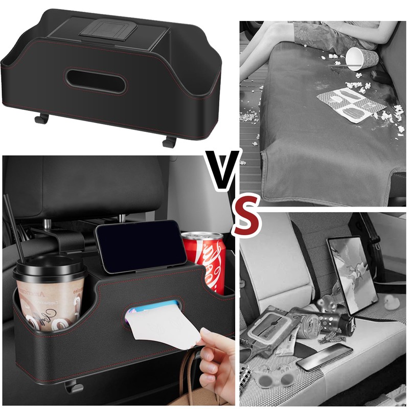 - 【Convenient Design】: Equipped with 2 drink cup holders and a tissue box, this back seat car organizer allows you to store drinks and tissues effortlessly, keeping your backseat organized and clutter-free during every journey.