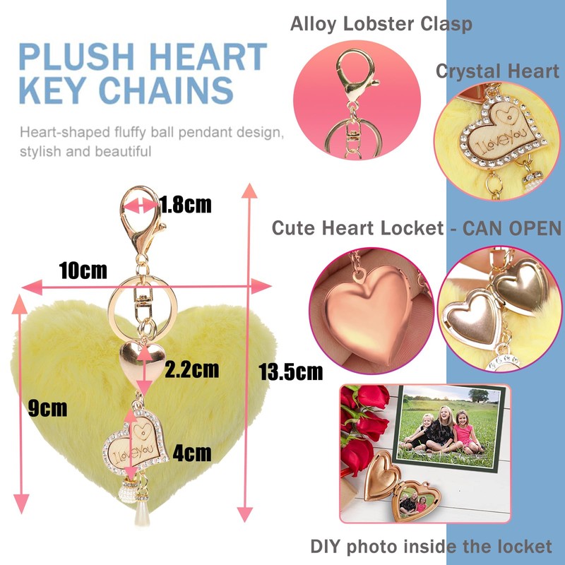 - Fashion accessory & can separately used - You can use each accessory separately. Pompoms Heart Ball come with a tiny elastic loop, soft and cosy. Crystal I LOVE YOU and Photos Heart Locket are also fashion Pendants. You can use them with a keychain to attach them to your projects. They also can be attached directly to knitted hats, bags, scarves, shoes, mobile phones, wallets, backpacks, handbags, lanyards and car pendants, DIY accessories, etc.