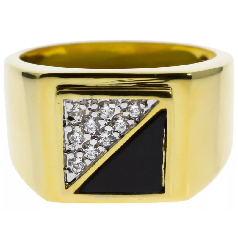 This handsome Contemporary Diagonal BLACK Onyx Men's ring has 9 classic radiant cut excellent Russian formula clear CZ stones, beautifully set in smooth 18k yellow gold overlay.