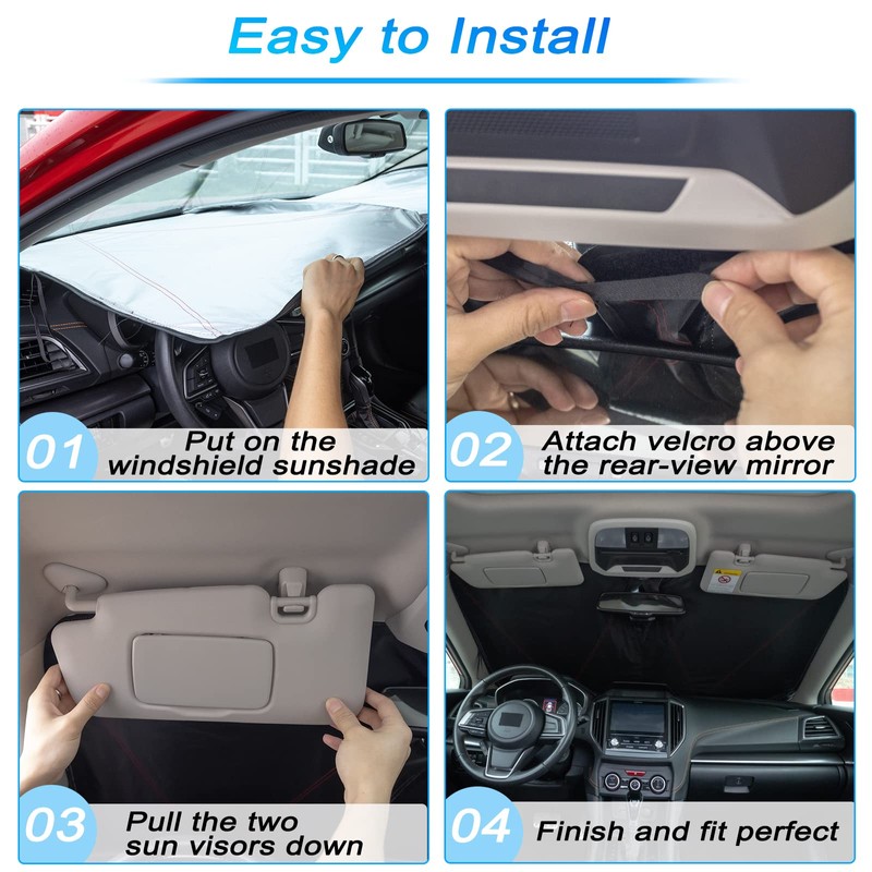 - 【Easy to Install and Store】Simple installation, make the sunshade fits the edge of the windshield, stick the Velcro, and put down the two sun visors to increase the support and done. When not in use, you can simply store it in the pouch