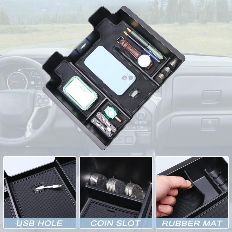- 【Convenient design】 Included cut-outs for the light and the USB, you can still see needed items at night and charge your phone when you need it. Here are no-slip rubber liners for each compartment to prevent items from making noise and sliding around