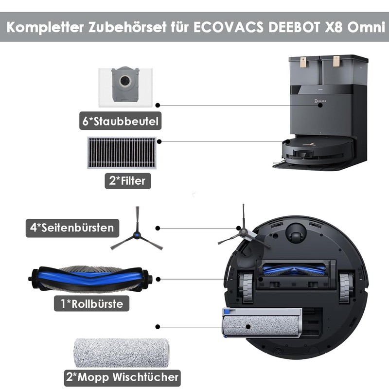 - [Anwendung] Nur f??r ECOVACS DEEBOT X8 PRO Omni/ ECOVACS DEEBOT X8 Omni. Das Paket enth?lt: 1 Main Rollb??rste, 4 Seitenb??rsten, 6 Staubbeutel, 2 Wischmop, 2 Filter.
