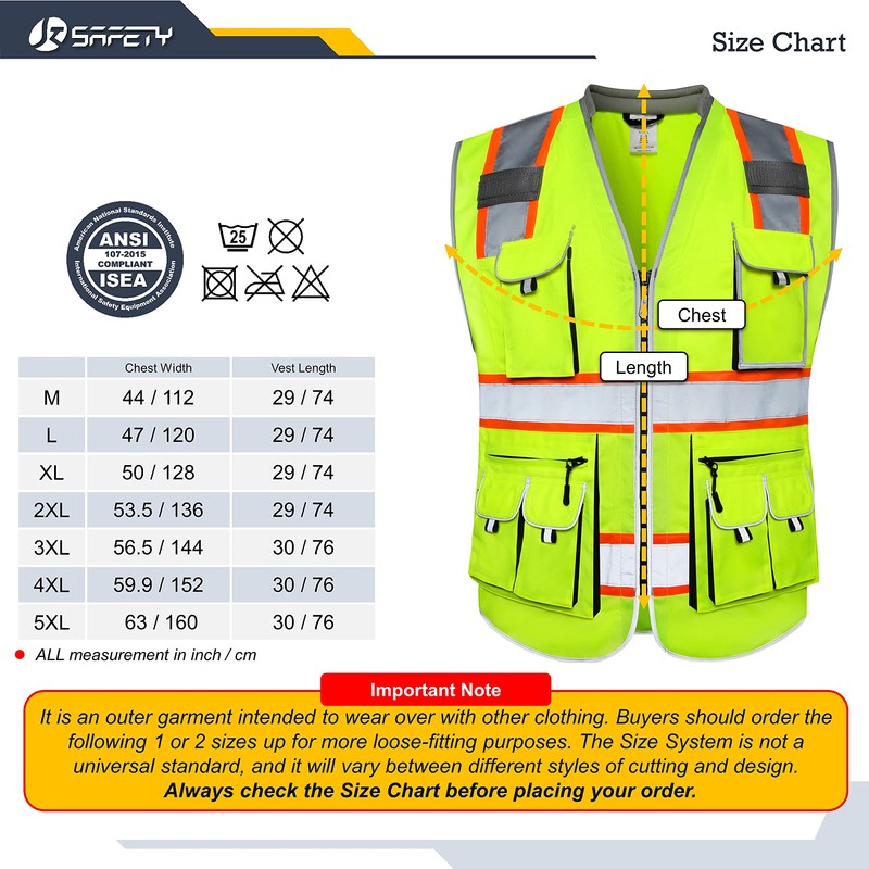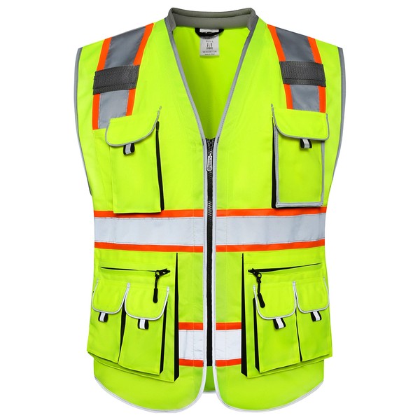 JKSafety 10 Pockets Class 2 Hi-Vis Zipper Front Yellow Safety Vest | Cushioned Collar | High Reflective Tapes with Extended Neon Orange Strips | Meets ANSI/ISEA Standards (X-Large, 89-Yellow)
