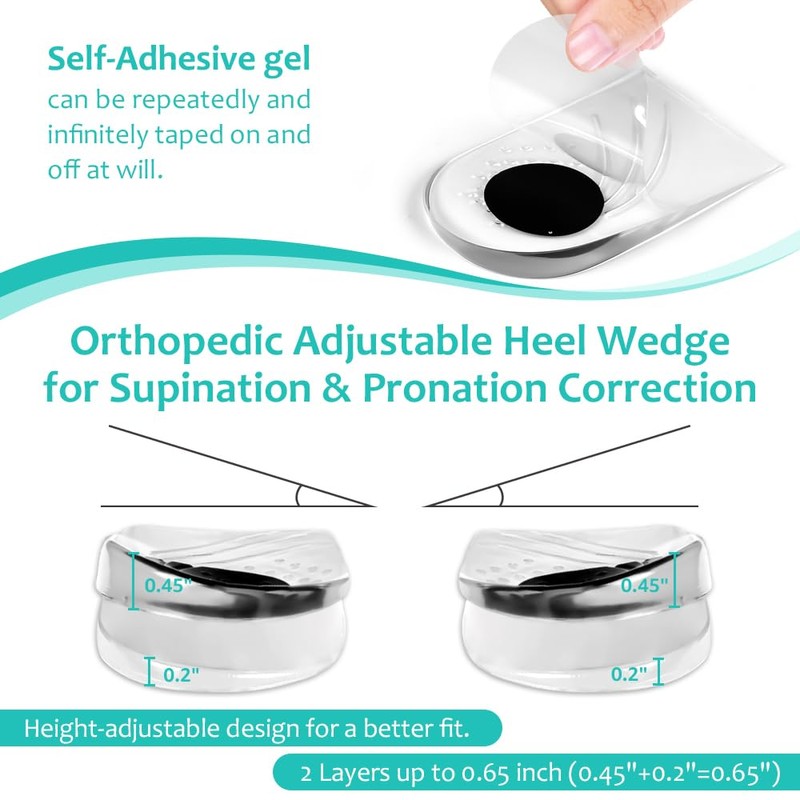 - 2 Layers Adjustable Design: Only Design by JL-Group. Smooth and well-crafted edges avoiding rubbing your feet. Two removable layers for optimum heel lifts customization. Adjustable self-adhesive layers allow you to adjust the height by adding layers yourself. These self-adhesive layers can be used individually as well as combination. Our clear heel wedges insoles are very invisible and won't bring down the value of your shoes.