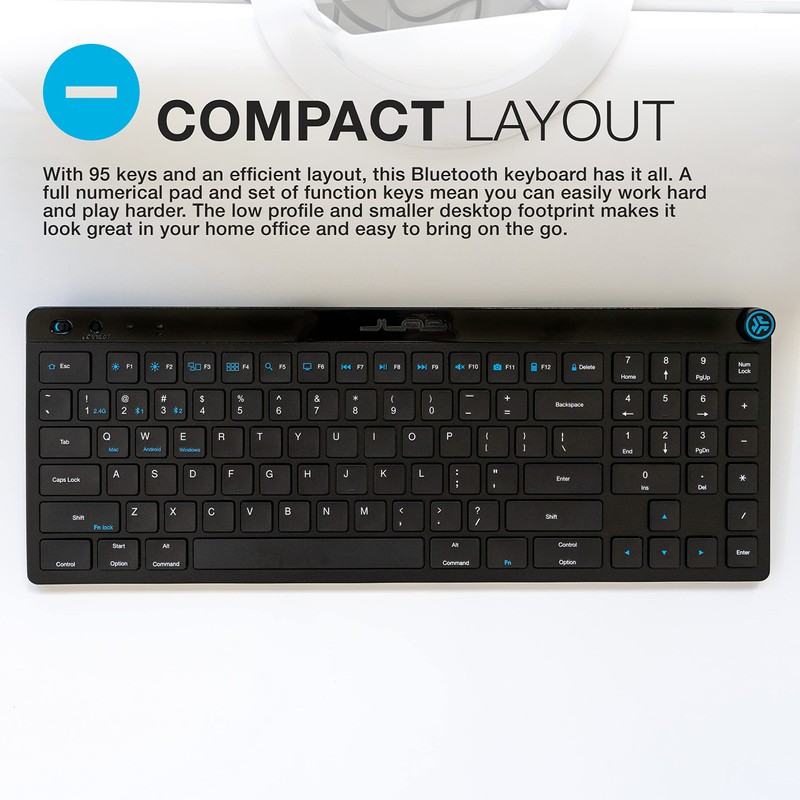 - ⌨️ COMPACT LAYOUT With 95 keys and an efficient layout, this Bluetooth keyboard has it all. A full numerical pad and set of function keys mean you can easily work hard and play harder. The low profile and smaller desktop footprint makes it look great in your home office and easy to bring on the go.