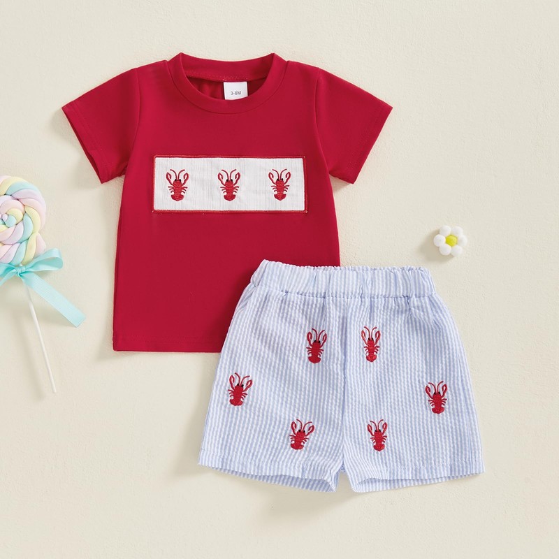 Toddler Boy Summer Outfits Lobster Embroidery Round Neck Short Sleeve Tops with Stripe Shorts Outfit