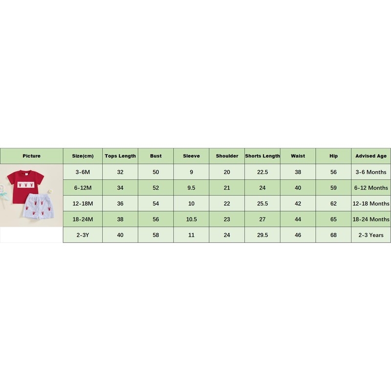 6-12M Tops Length: 13.39 Bust: 20.47 Sleeve: 3.74 Shoulder: 8.27 Shorts Length: 9.45 Waist: 15.75 Hip: 23.23 Advised Age: 6-12 Months