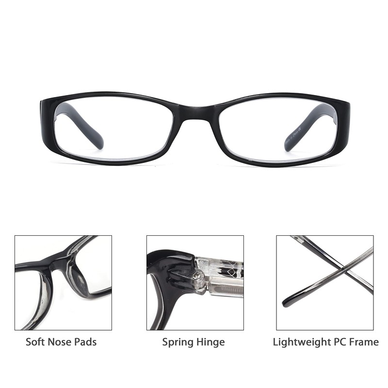- Lightweight, rectangular composite frames and lenses with durable spring hinges ensure a comfortable fit without unpleasant pinching