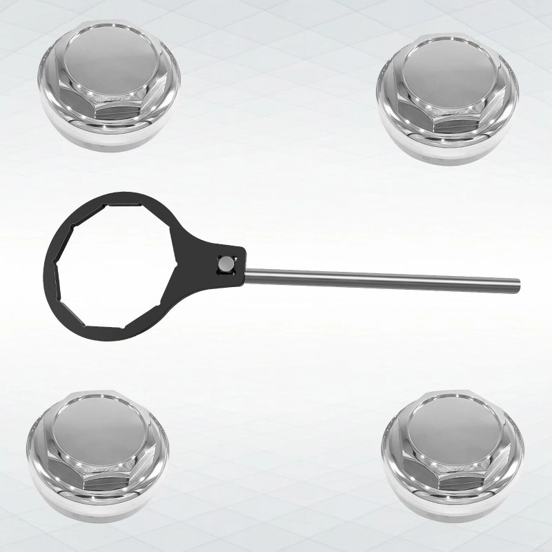 This wrench is compatible with other brands of 10-sided Bullet spinner caps for 13-22” wire wheels. The wrench span measures 3.9” (100 mm)