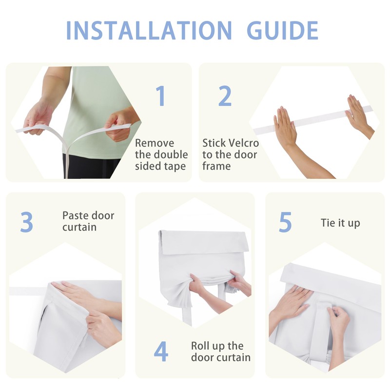 - 【Easy Installation】Door curtain come with 1-door curtain panel and 2-adhesive strip. No tools or curtain rods are required. Follow our instruction picture to install, stick straps to the door frame and joint together with the sticking place on door curtain panels firmly. Also, tie up the curtain with straps attached for sightseeing or the drapes down for full privacy.