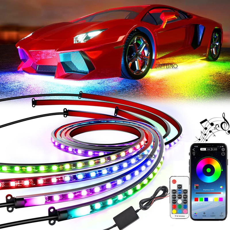 JMTBNO 6Pcs RGB Wireless Car Underglow Tube LED Neon Kit Strip Light Music APP Remote