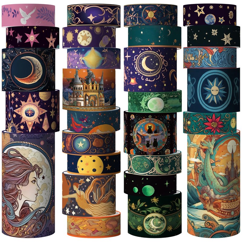 - Magic Theme Design -29 rolls of magic theme washi masking tape sets. Each roll of washi tape contains different magic elements, including stars, crescents moon, witches, castles, gems, galaxy, dragons and other magic elements. The washy-tape has rich colors and diverse patterns, breaking your traditional impression of washi tape.