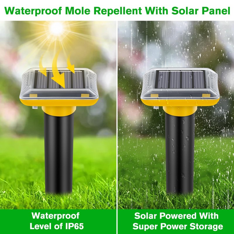 - Ultrasonic Mole Repellent-Easy to Use: In areas where moles, gophers, snakes or other burrowing rats are infested, insert the spikes of the gopher repellent into the ground and turn on the switch.Enjoy a beautiful and pest-free yard with these solar powered vole repellents.Plug and play, no tools required to install.NOTE: Charge the solar mole repellent in the sun for at least 2 days before installation