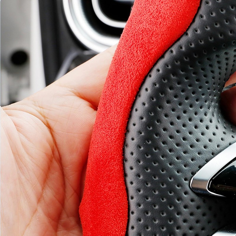JNNJ Universal Non-Slip Grip Thin Suede Segmented Steering Wheel Cover, Suede Car Steering Wheel Cover, Suitable Comfortable, Non-Slip and Durable (Red)