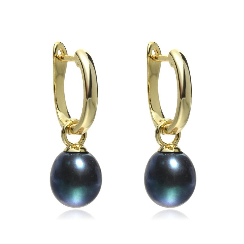 Jo & Co. Freshwater Cultured Pearl and 925 Sterling Silver Gold Plated, Lyre Shaped Hoop and Drop Earrings, 8 X 10 mm Peacock Black Pearl, Detachable Pearl, Some Variation in Colour Tone May Occur