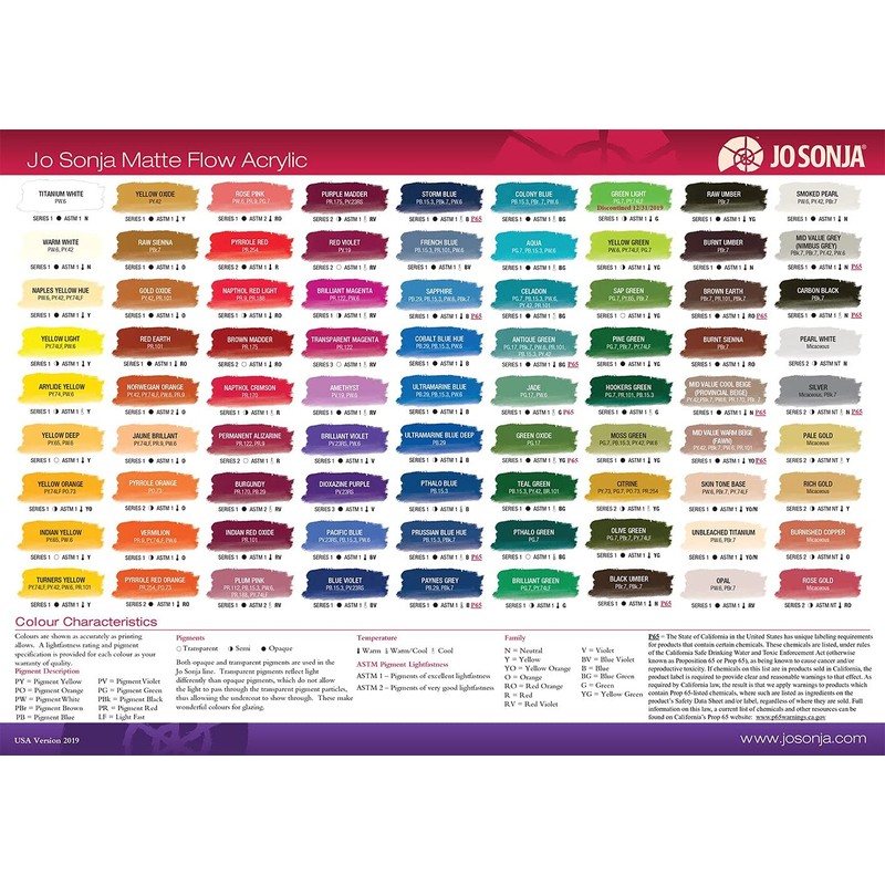 - Flow formula acrylics offering opacity of color and beautiful, velvet matte finish.