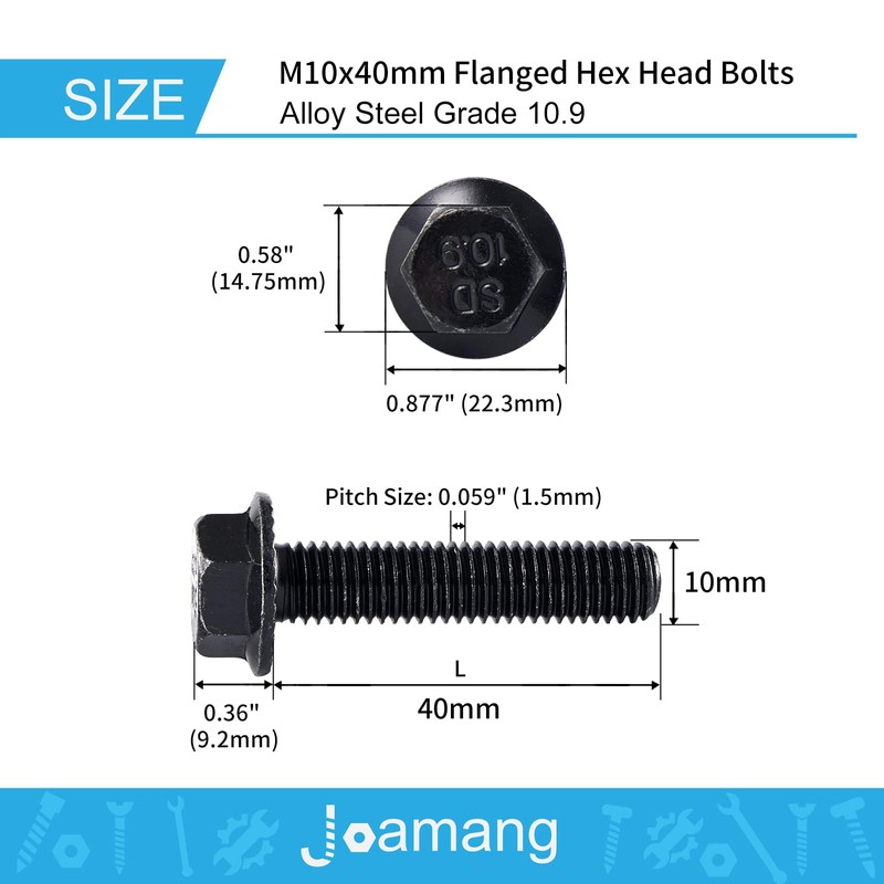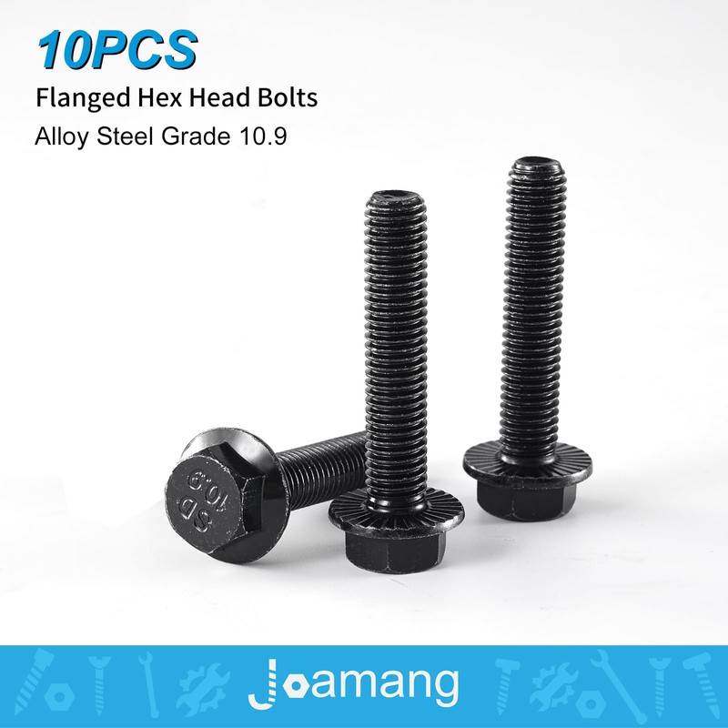 Joamang M10 x 40mm 10Pcs Flanged Hex Head Bolts, M10 x 1.5 Bolts, Flange Hexagon Head Screws, 10.9 Grade Alloy Steel, Black Oxide Finish, Metric Fully Thread