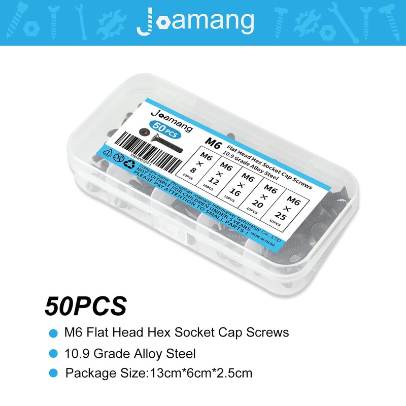 Joamang M6 x 8mm 12mm 16mm 20mm 25mm Flat Head Hex Socket Cap Screws Countersunk Bolts, 10.9 Grade Alloy Steel, Black Oxide Finish, Metric Allen Drive, Fully Threaded, Assortment Kit 50Pcs