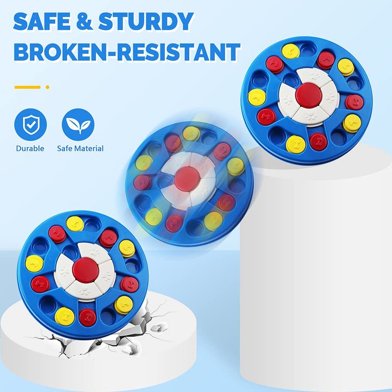 - 【CHALLENGING DOG PUZZLE TOYS】Our dog puzzles for smart dog is designed with more challenging skills , not too easy. Your pups have to learn how to combine multiple steps to retrieve the hidden treat.They need to learn how to move the red round slider to the center for hide food with a right point. And when want to spin the centre wheel , have to slide the red slider away . At first try, smart pets feel hard to finish the game in seconds, keep long intereste in playing.