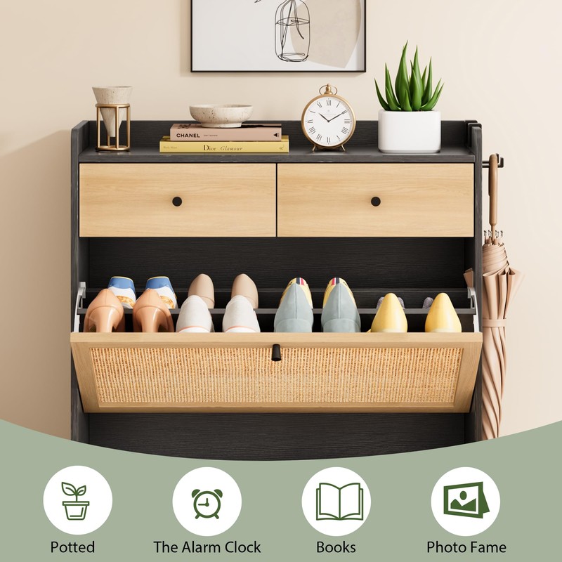 Jocoevol Rattan Shoe Cabinet Storage for Entryway, Narrow Wood Shoe Cabinet with 2 Flip Drawers & 2 Drawers, Freestanding Hidden Shoe Organizer with Metal Legs, Black