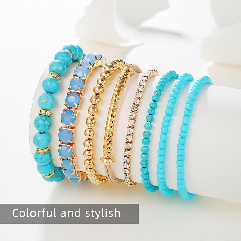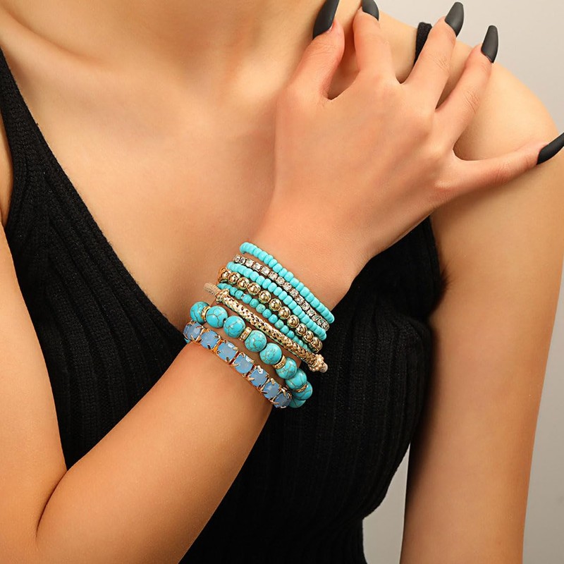 - Show off the hot selling 6 piece turquoise beaded bracelet set in bohemian style: we present you a beautiful bohemian style bracelet set, consisting of 6 bracelets, each made of stunning turquoise beads and rhinestone embellishment.