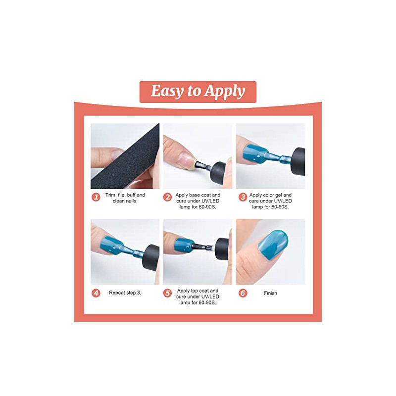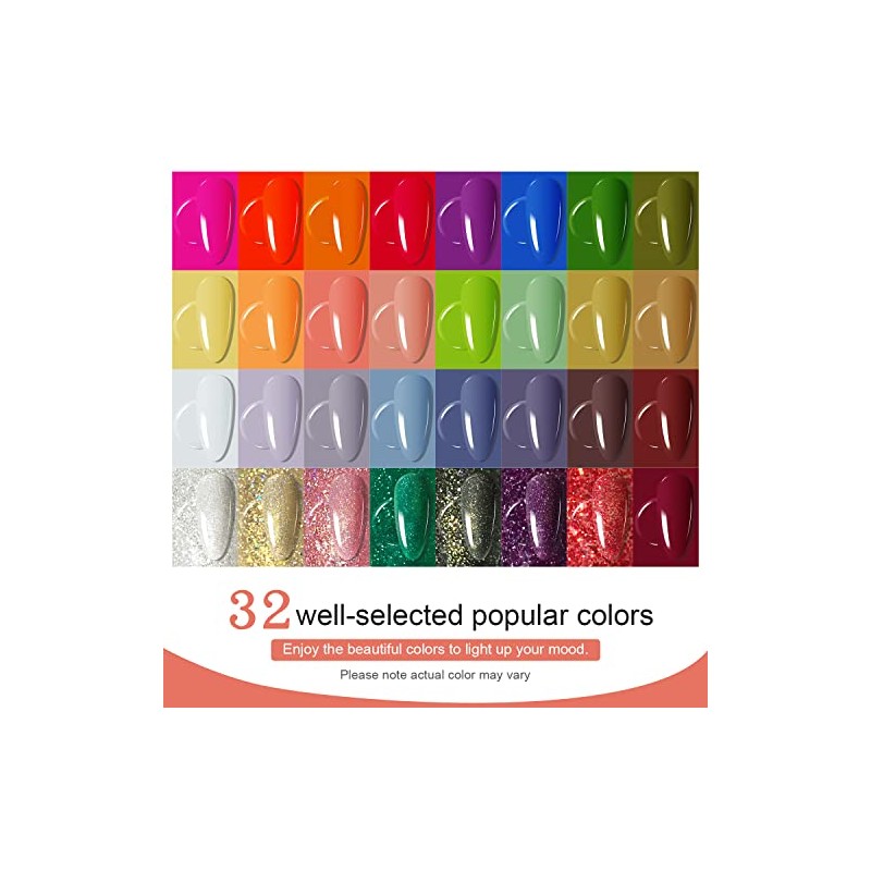 - Salon Quality Gel Nail Polish: 32 popular and beautiful colors nail polish, include orange, gray, flesh pink, rose red, green, blue, purple, etc. glitter styles for all occasions. Every colors can be harmoniously matched. You can DIY your nails the way you want.