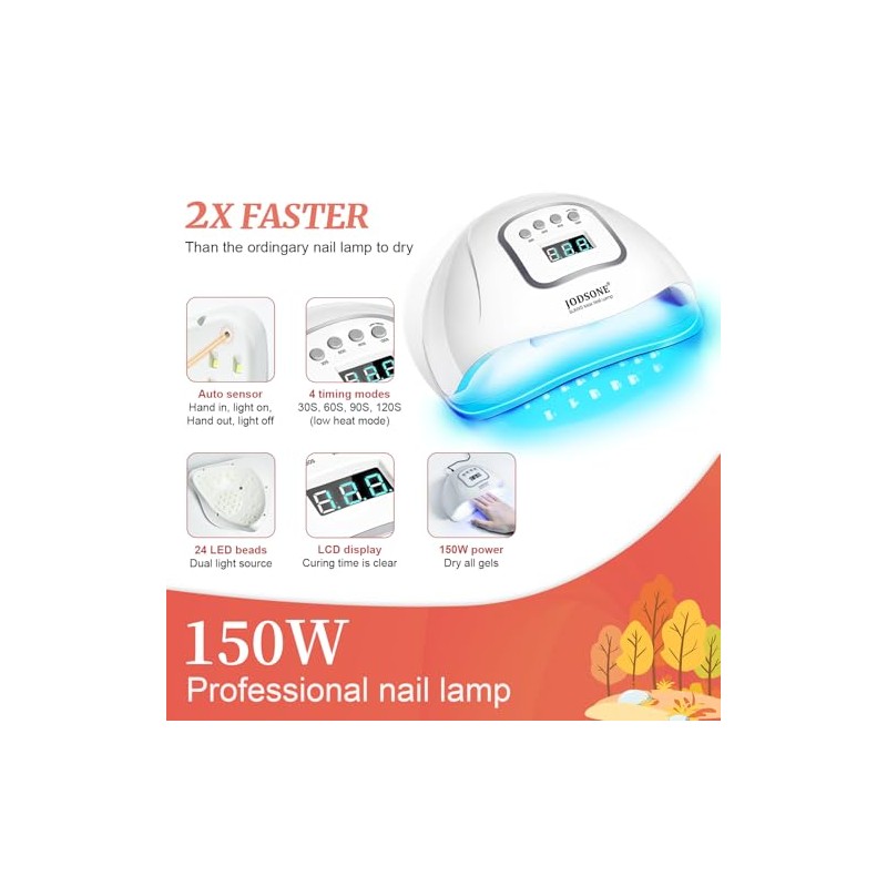 - Nail Light: Fast drying lamp nail polish dryer with 4 timer settings 30s/60s/90s/120s, LCD screen shows the usage time - Detachable bottom design - Smart auto sensor: hands in light on, hand out light off.